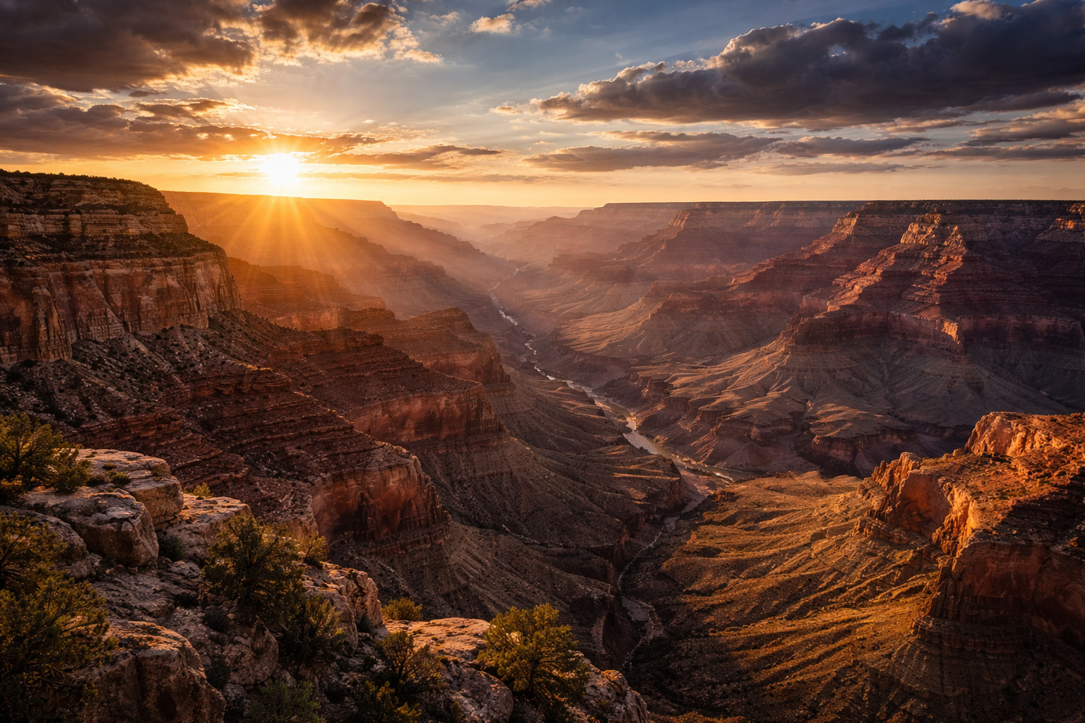 Cinematic wide angle landscape of the Grand Canyon during golden hour, glowing orange and red rock layers, deep shadows in the canyons, dramatic sky with scattered clouds, Colorado River visible in the distance, shot on 24mm lens, high dynamic range, ultra-detailed textures, 8k resolution, National Geographic style –ar 16:9