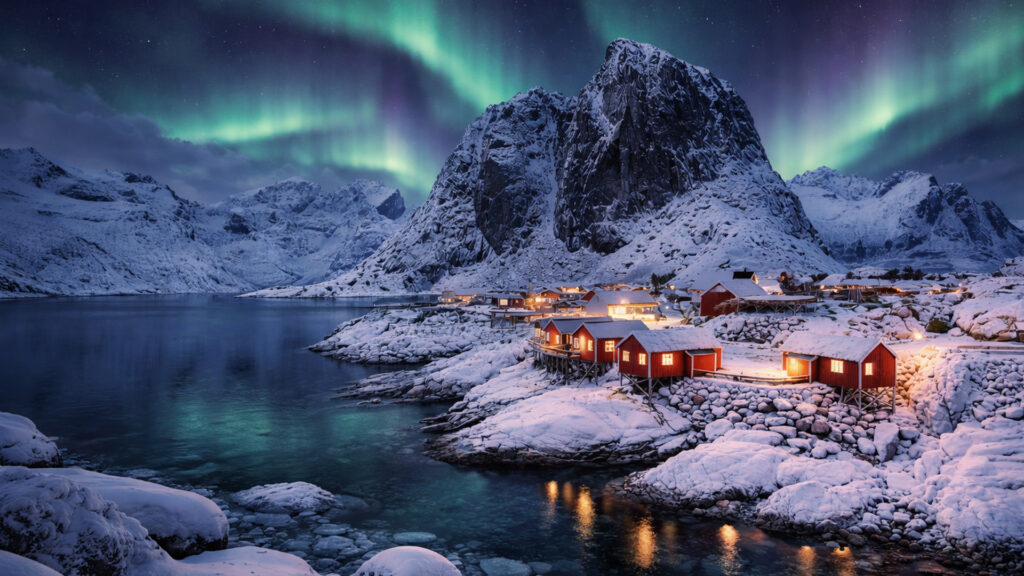 „Hyper-realistic, wide-angle landscape photograph of the Lofoten Islands in Norway… The iconic red fishing huts (rorbuer) of Reine…“