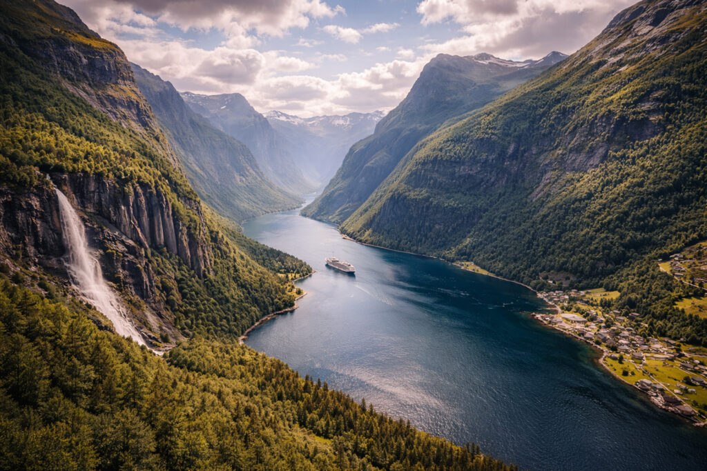 Hyper-realistic aerial landscape photograph of Geirangerfjord, steep green cliffs descending into deep blue fjord waters, waterfalls streaming down rock faces, summer sunlight breaking through clouds, cinematic depth, ultra-detailed textures, professional travel photography, natural color grading, 8k resolution –ar 16:9