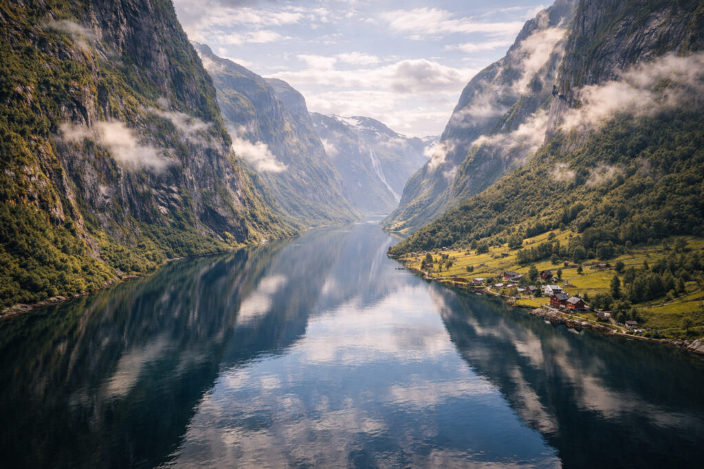 Hyper-realistic cinematic landscape photograph of Nærøyfjord with towering cliffs and calm fjord waters, soft mist drifting along mountain slopes, small village by the shoreline, summer atmosphere, natural Nordic lighting, ultra-detailed textures, calm and majestic mood, professional landscape photography, 8k resolution –ar 16:9