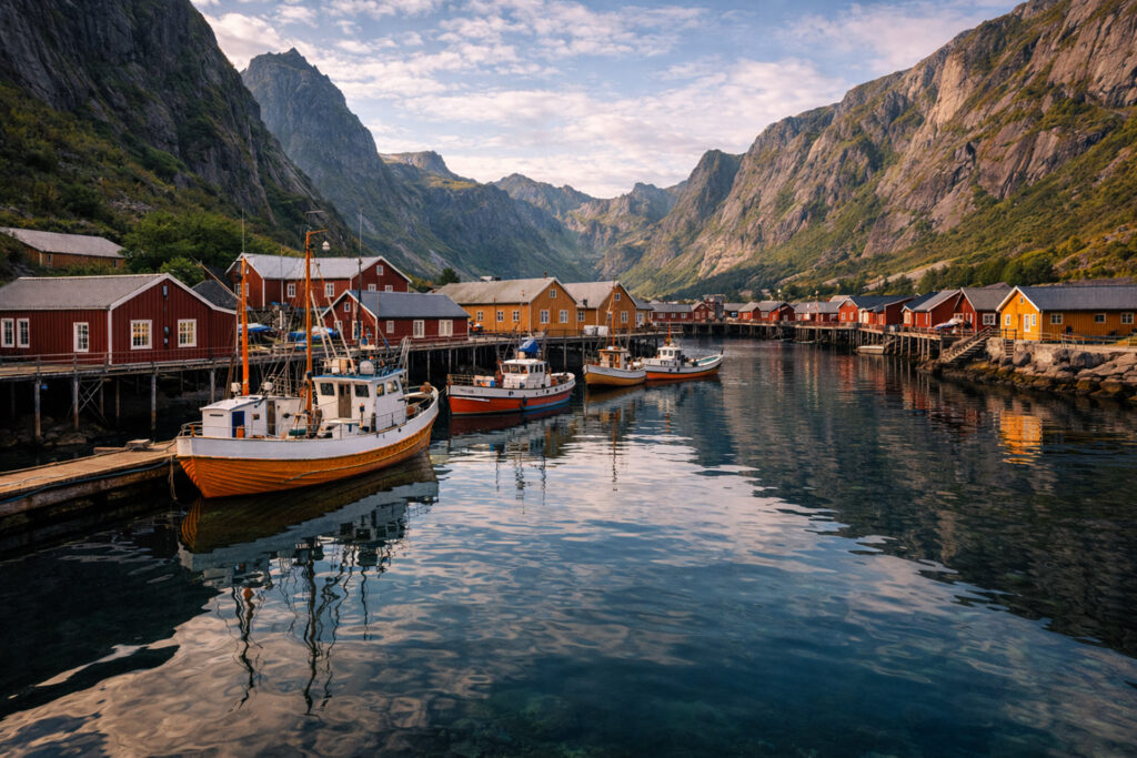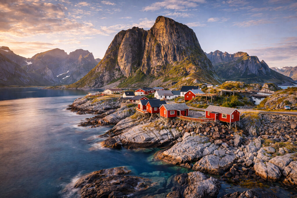 Die Architektur der Inseln ist untrennbar mit dem Meer verbunden. Die leuchtend roten Rorbuer – ehemalige Fischerhütten – stehen auf Stelzen direkt über dem Wasser, um den Gezeiten zu trotzen und den Fischern direkten Zugang zu ihren Booten zu ermöglichen.