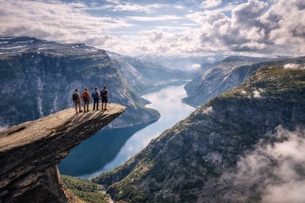 Hyper-realistic cinematic landscape photograph of Trolltunga cliff overlooking Norwegian fjords, hikers standing at the edge, dramatic mountain landscape, summer weather, soft cloud formations, epic scale, ultra-detailed terrain textures, professional adventure photography, natural color grading, 8k resolution –ar 16:9