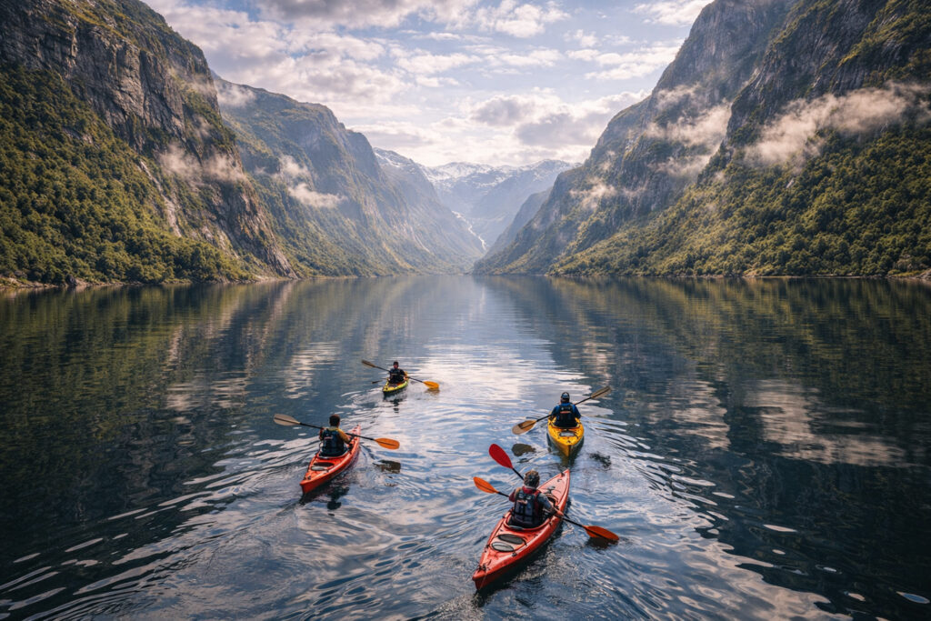 Hyper-realistic cinematic landscape photograph of kayakers paddling through calm Norwegian fjord waters, towering mountains surrounding them, summer sunlight, subtle reflections, peaceful atmosphere, ultra-detailed textures, professional travel photography, natural color grading, 8k resolution –ar 16:9