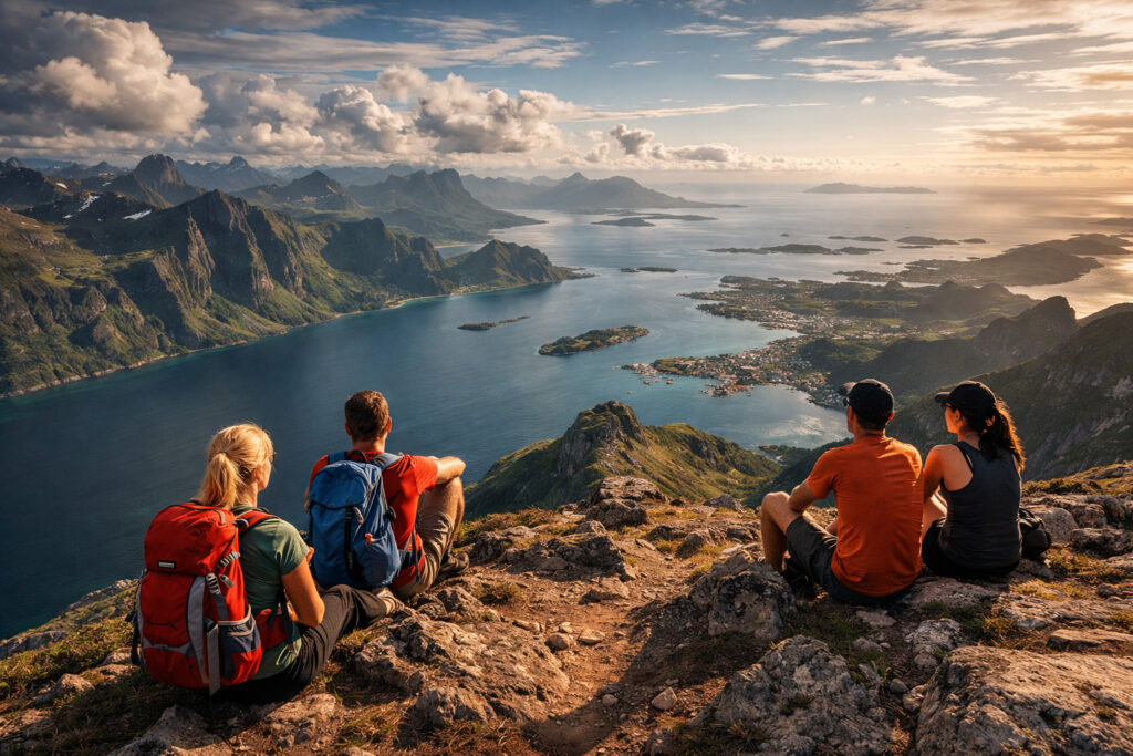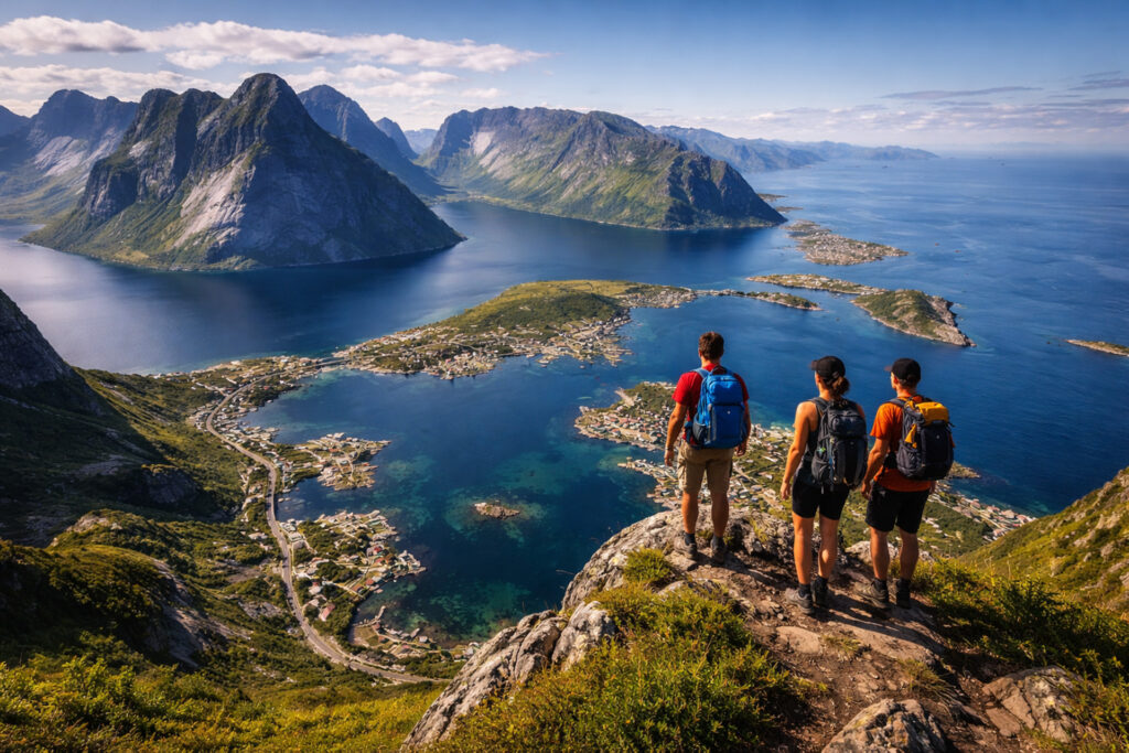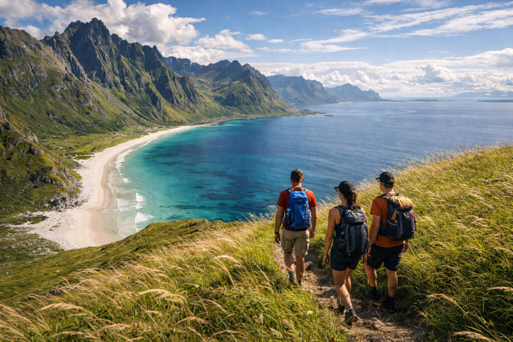 Hyper-realistic cinematic hiking scene in the Lofoten Islands during summer, hikers walking along a mountain ridge above turquoise fjords and white sand beaches, bright Nordic sunlight, green slopes, dramatic peaks, soft sea breeze atmosphere, natural colors, professional adventure photography, ultra-detailed terrain, 8k resolution –ar 16:9