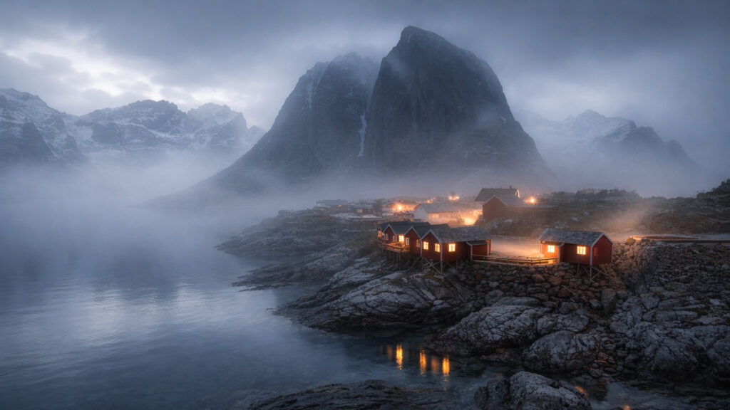 - Subjekt & Ort: Die KI greift auf ein riesiges Archiv an Bildern der Lofoten zu. Durch die Nennung von „Reine“ und „Rorbuer“ weiß die KI exakt, welche Architektur (rote Hütten auf Stelzen) und welche Bergformationen (der charakteristische Olstind) erforderlich sind.