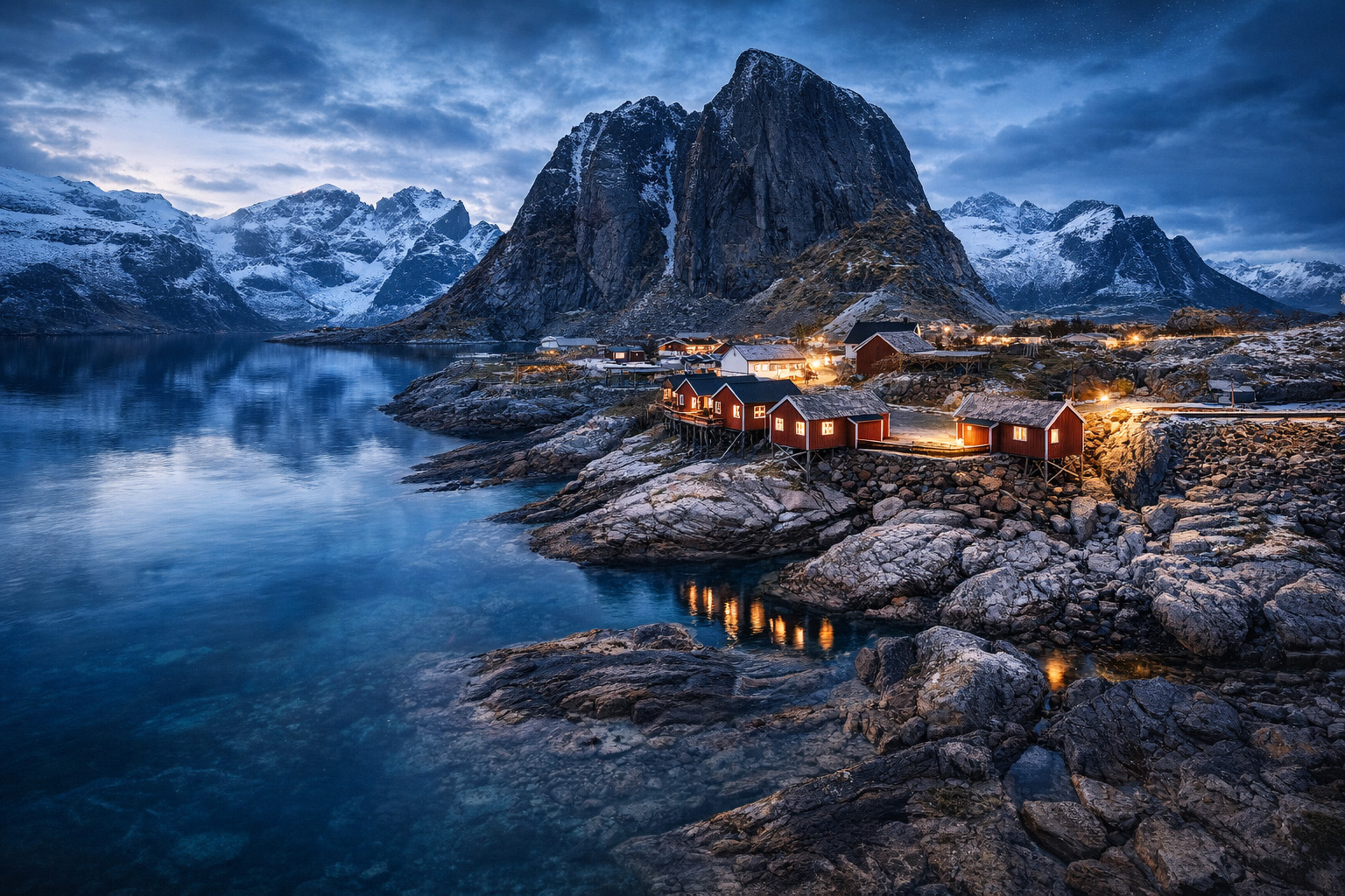 Hyper-realistic cinematic landscape photograph of Reine village in the Lofoten Islands during summer blue hour, red rorbuer cabins along the fjord, steep mountains rising from the water, soft evening light, calm fjord surface, warm window lights contrasting cool Nordic tones, ultra-detailed textures, natural color grading, cinematic atmosphere, professional travel photography, 8k resolution –ar 16:9