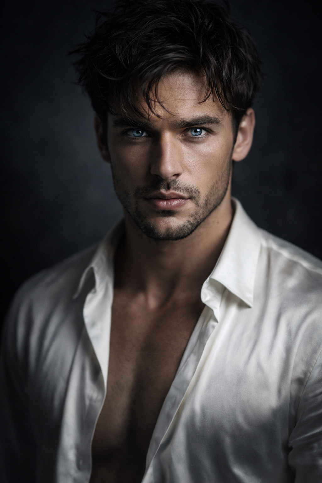 Stunning close-up editorial portrait of a handsome young man with dark messy hair and piercing blue eyes, masculine facial features, athletic physique, wearing an unbuttoned white silk shirt, dark moody studio background, dramatic cinematic lighting, soft shadows, high-end fashion photography style, shot on 85mm lens, f/1.8, sharp focus on eyes, 8k –ar 4:5