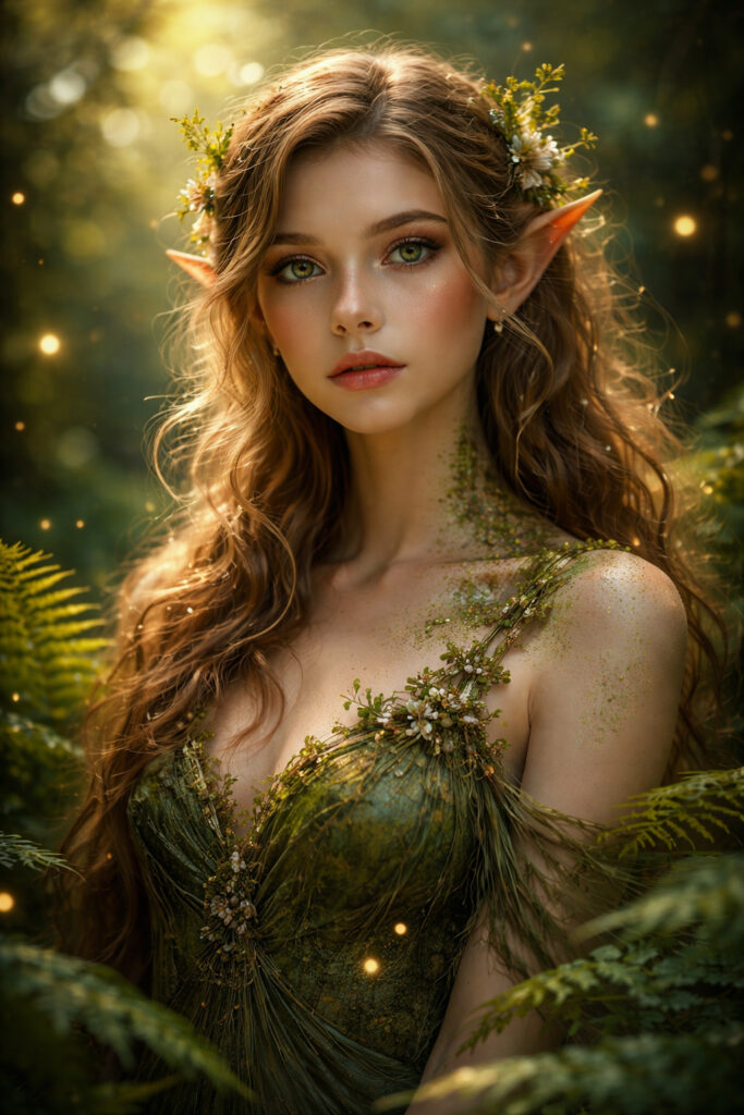 Ein verträumtes Nahaufnahme-Portrait einer ätherischen Gestalt im tiefen Wald. Das Gesicht ist teilweise von Farnen eingerahmt, und kleine Lichtpunkte (Glühwürmchen) schweben in der Luft.