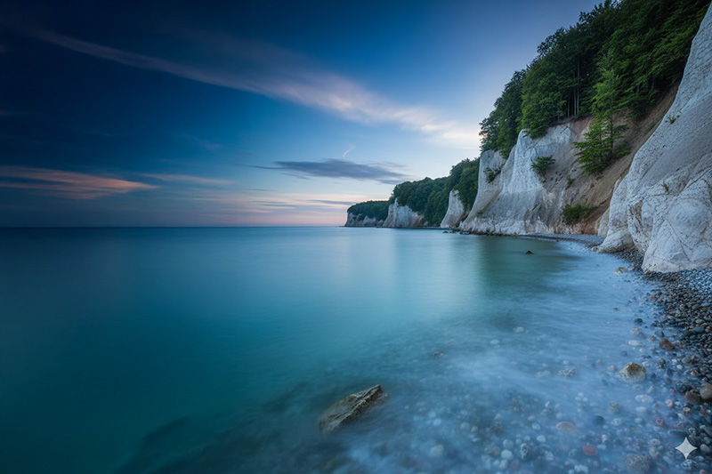 Eine hochauflösende Landschaftsaufnahme der Rügener Kreidefelsen zur Blauen Stunde. Der Fokus liegt auf dem Kontrast zwischen den weißen Klippen, dem türkisfarbenen Wasser der Ostsee und der sanften Langzeitbelichtung der Wellen.