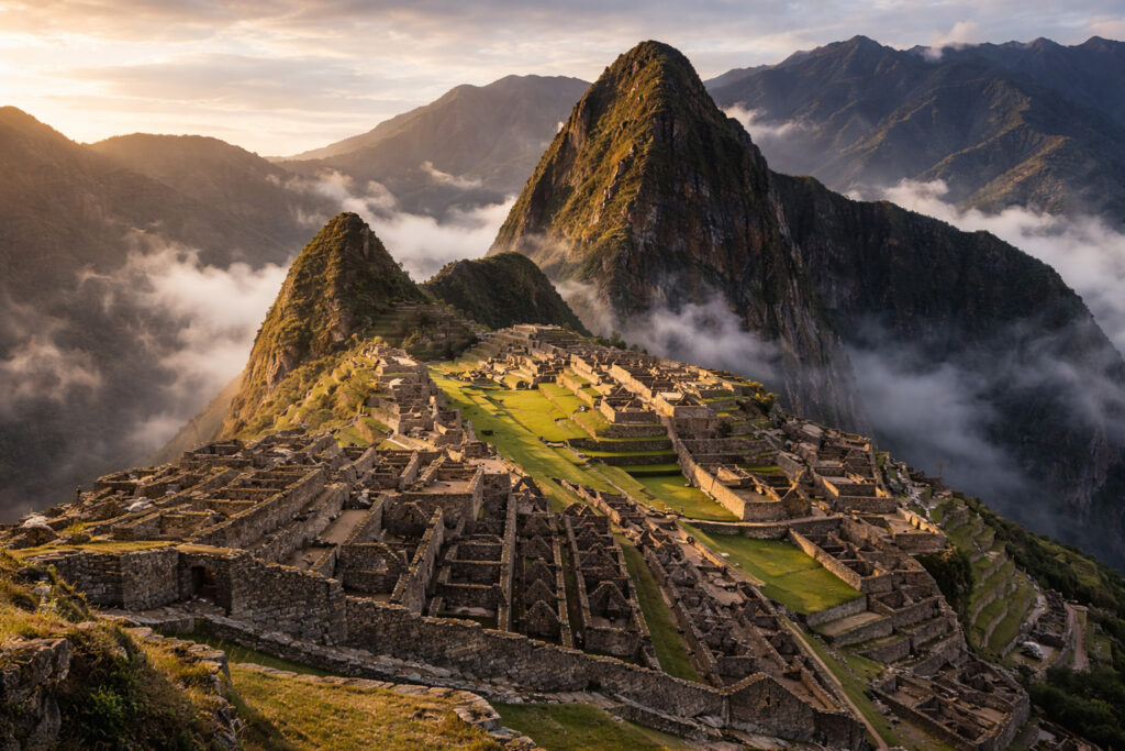 Wenn die ersten Sonnenstrahlen über die Gipfel der Anden brechen und die Ruinen von Machu Picchu aus dem Morgennebel schälen, wird die Genialität der Inka-Architektur greifbar. Dieses Bild fängt die magische Stille eines Ortes ein, der wie kein zweiter die Verbindung zwischen menschlicher Schöpfungskraft und der Erhabenheit der Natur symbolisiert.